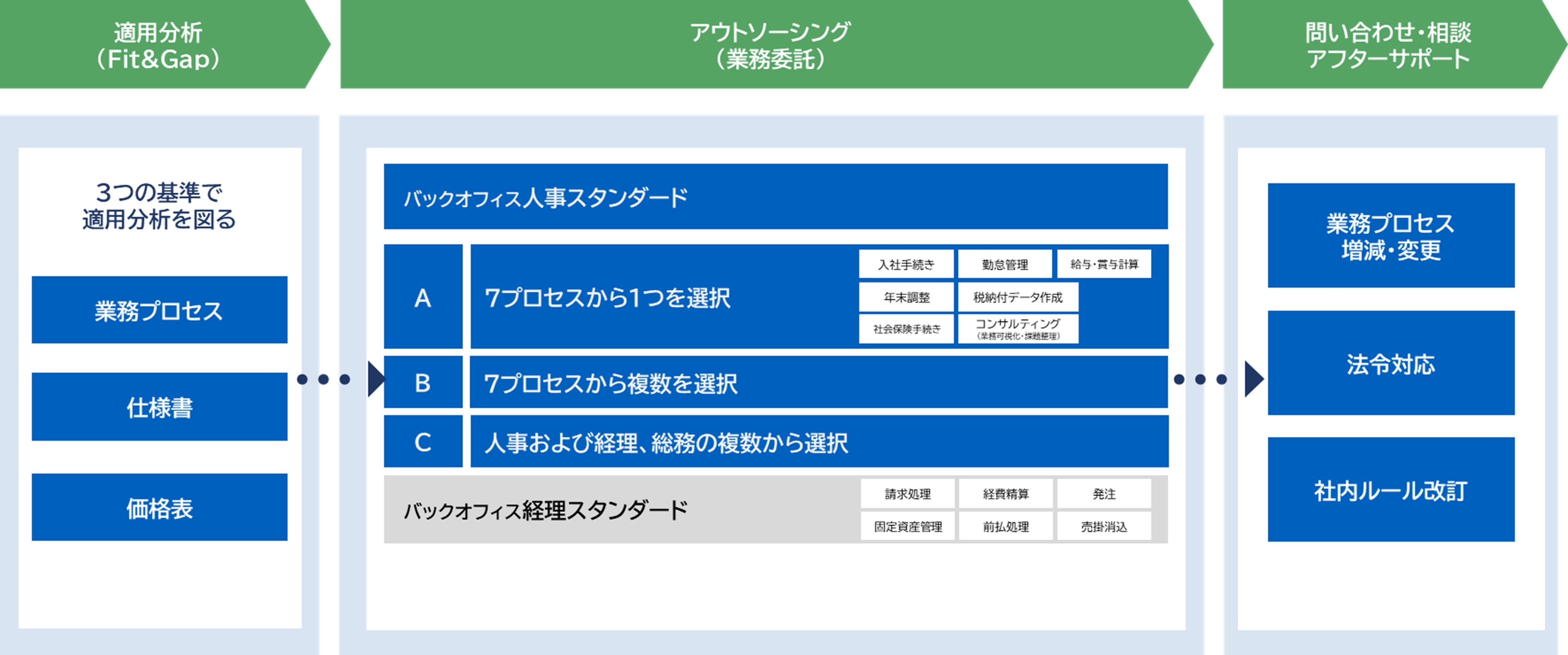 業務アウトソーシング中のプロセスの変更、法令対応、社内制度・ルール改定など相談、また一定範囲内での要件変更が可能です。