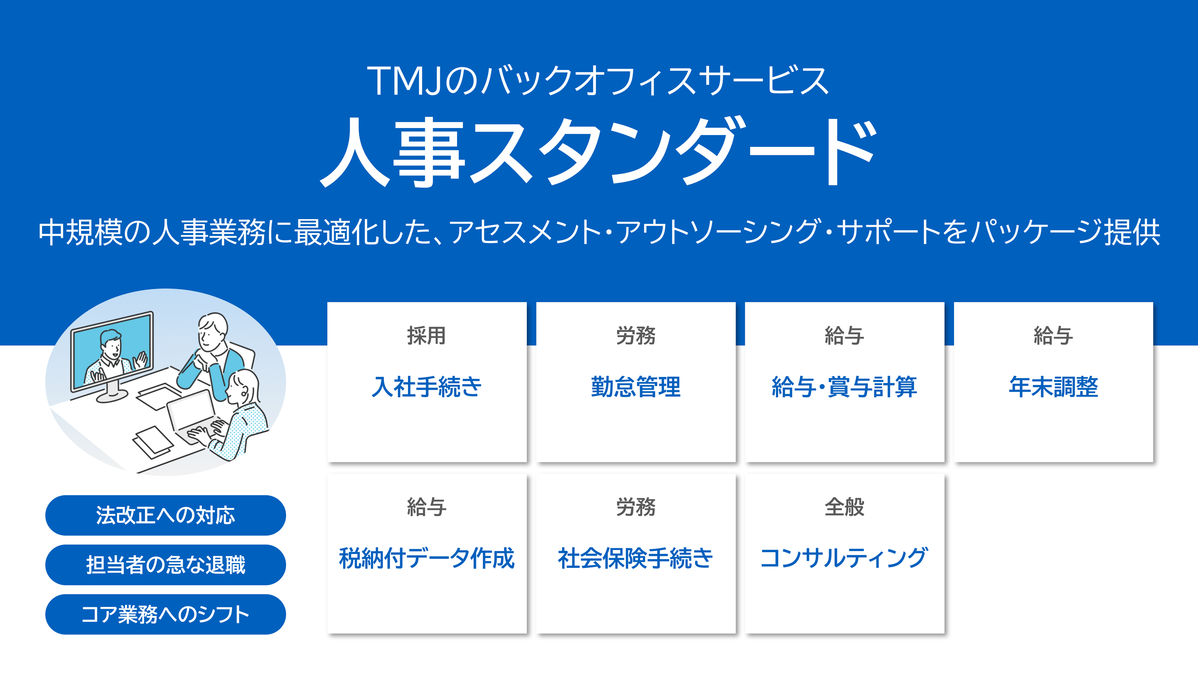 そこでTMJでは、代表的な人事定型業務を業務規模にあわせた標準化を図りました。また、セコムグループへの複数企業へサービス提供を行い、各企業の人事担当者とアウトソーシングにて年次・繁忙業務もスムーズに行い、全体最適化を実現したため、主に中堅企業の人事部門の問題解決を支援するサービスとしてパッケージングを行い、バックオフィスサービス『人事スタンダード』を提供開始する運びとなりました。
