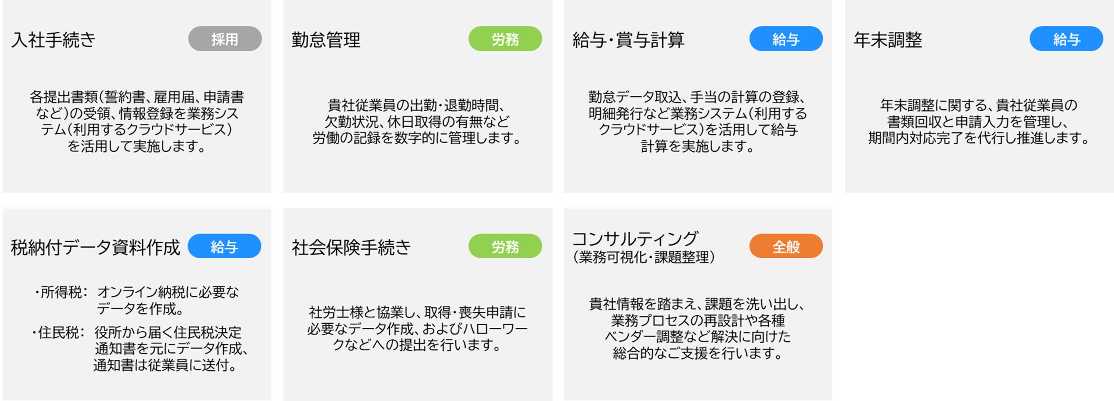 入社手続き、勤怠管理、給与・賞与計算、年末調整、税納付データ作成、社会保険手続き、業務可視化・再設計の7つの定型業務より単一、複数選択が可能です。