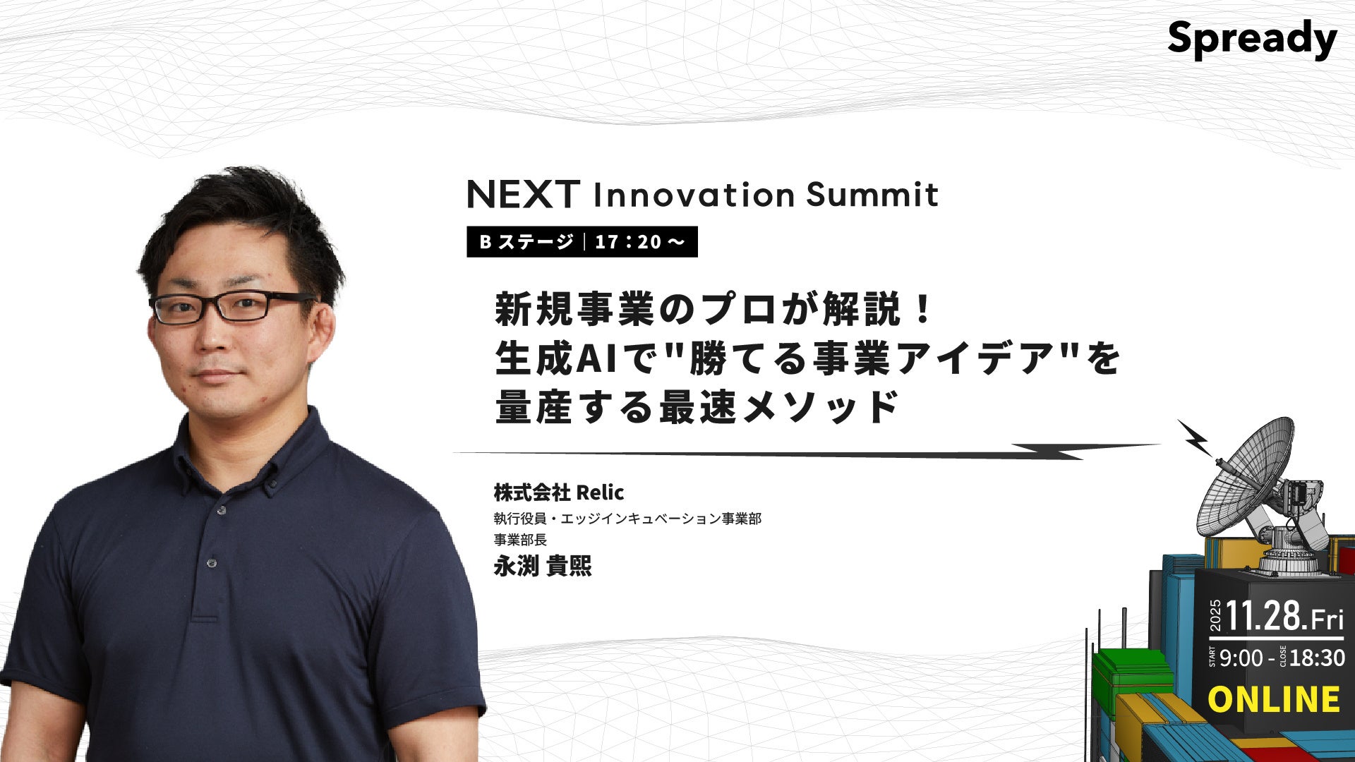 新規事業支援サービスを提供するSpready株式会社(本社:東京都渋谷区、代表取締役社長:佐古雅亮、以下「当社」)は、2025年11月28日(金)に新規事業の取り組みや知見を発信するカンファレンス「NEXT Innovation Summit 2025 in Winter 新規事業担当者のための『学び』と『出会い』があふれる1日(以下「本イベント」)」の全登壇者が確定したことをお知らせします。