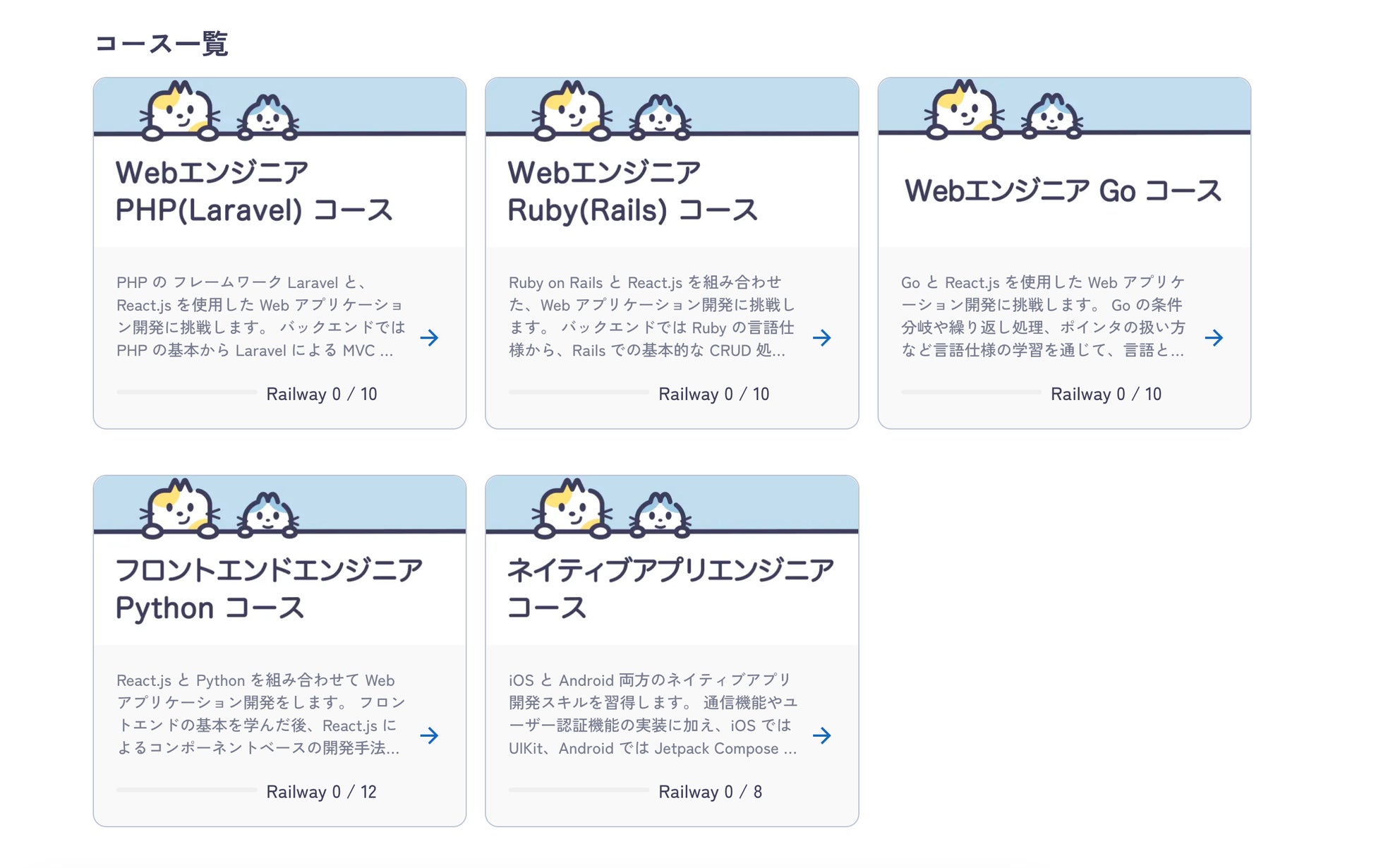 最前線で活躍する CTO やテックリードが監修したプログラミング学習コンテンツ(Railway)を、目的に合わせて効率よく学べるようにコースとしてまとめました。