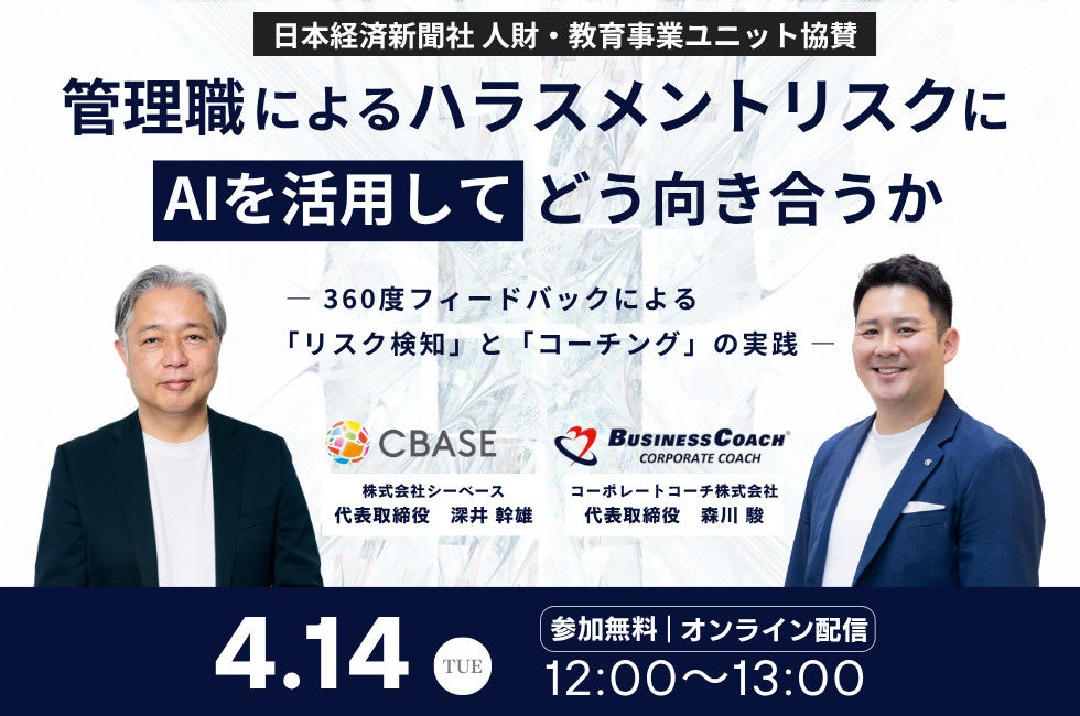 ビジネスコーチ株式会社(本社:東京都港区、代表取締役社長:細川 馨、東証グロース:9562)の子会社であるコーポレートコーチ株式会社(本社:東京都港区、代表取締役社長:森川 駿、以下当社)は、4月14日(火)に株式会社シーベース 代表取締役社長 CEO 深井 幹雄 氏をお招きしオンラインセミナーを開催いたします。