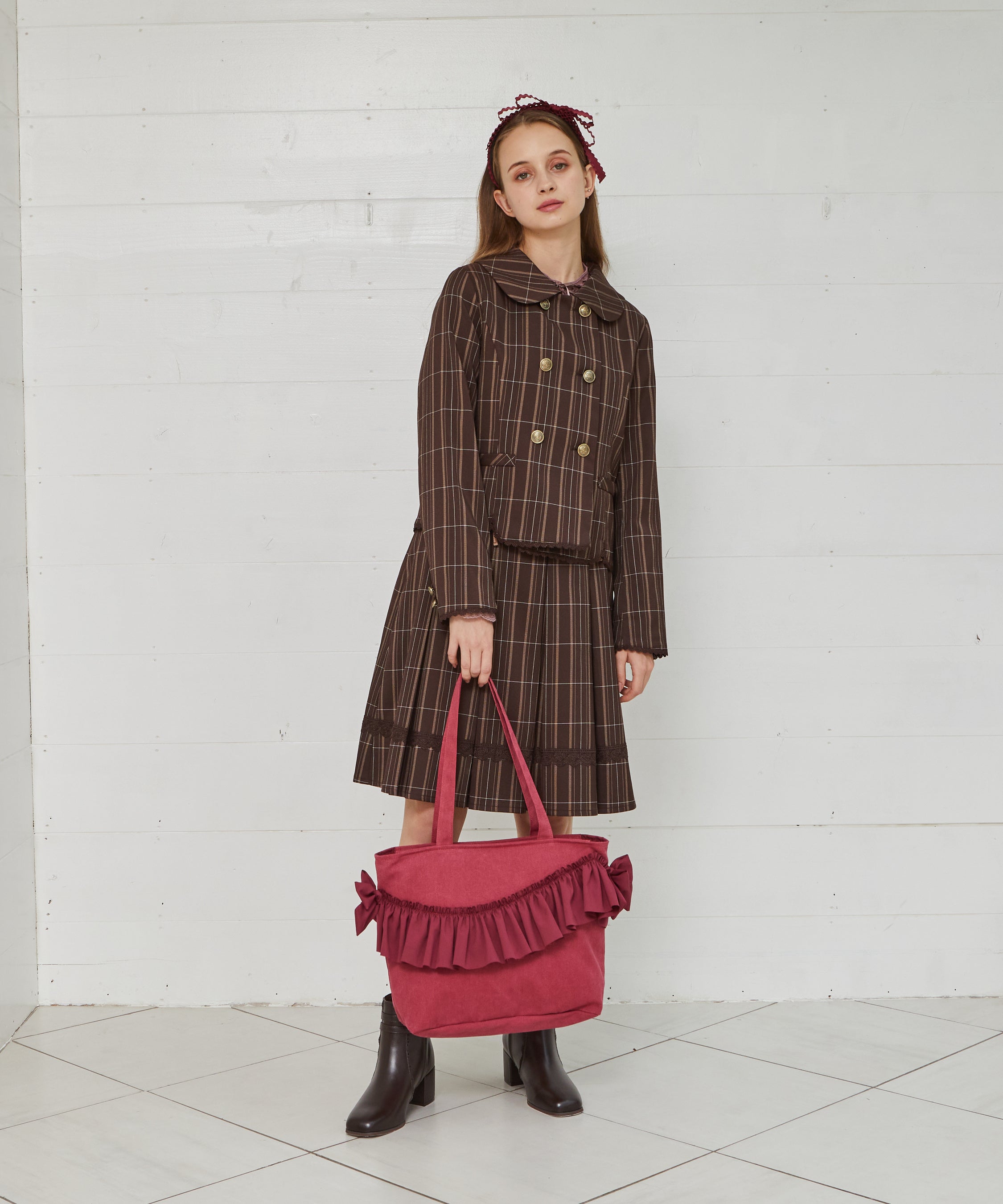 ジャケット×ベスト×スカートのレトロチックなフェミニンコーデ。オリジナルチェックの生地連動アイテムとなっています。