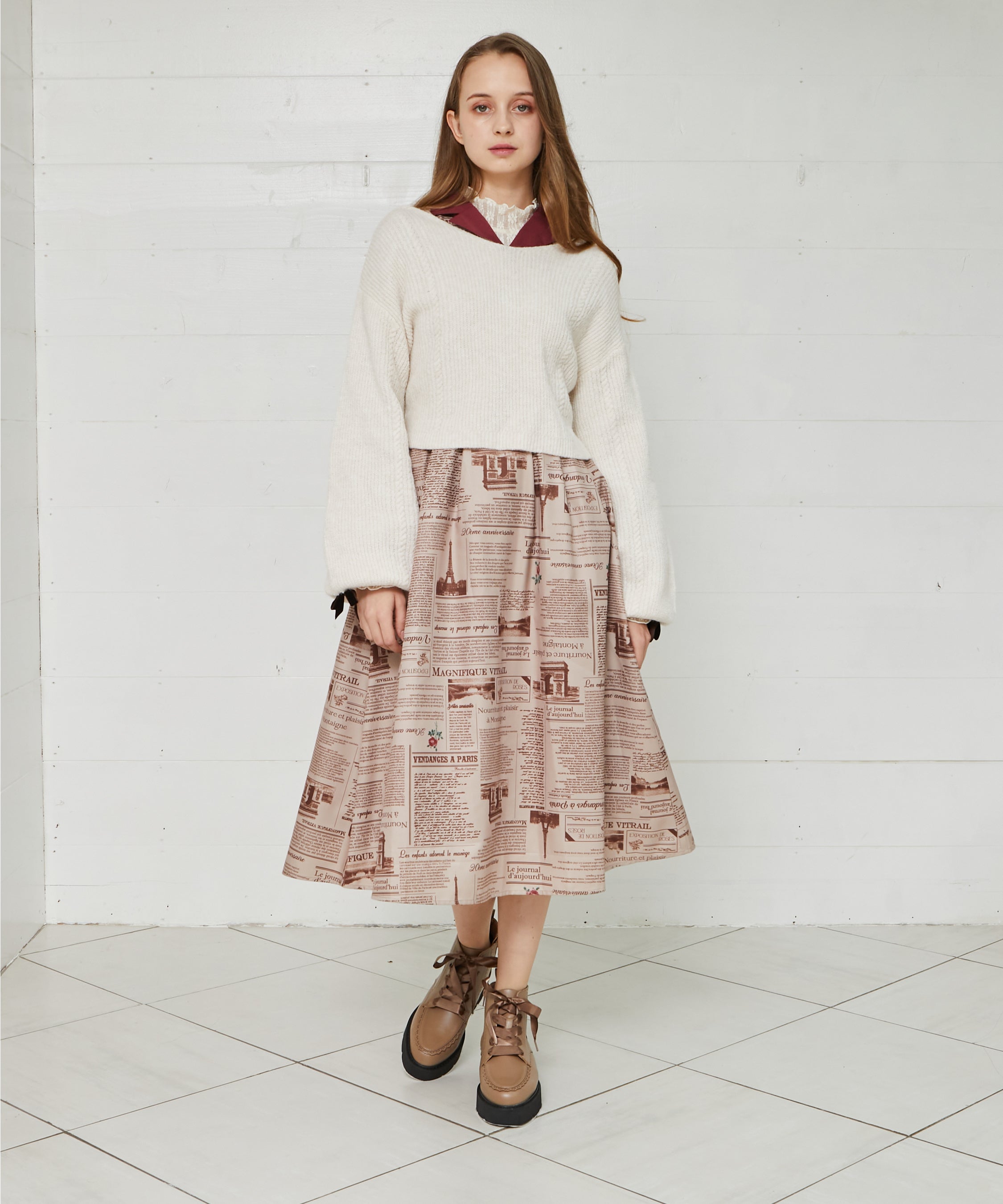トレンドのショートニットで一癖あるスタイリング。フランス語で『おたより・ニュース』という意味を持つ”ヌーベル柄”のワンピースです。