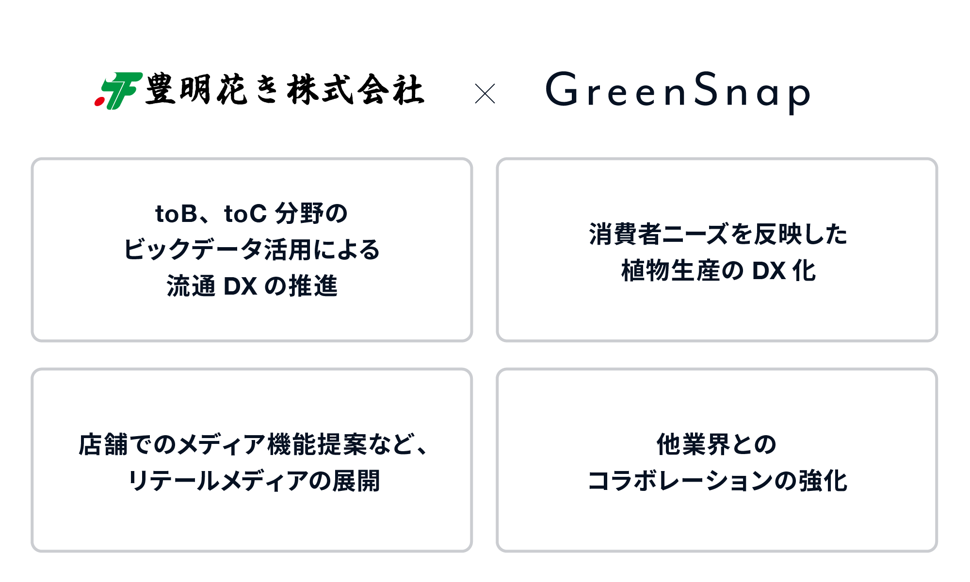 豊明花きの福永社長はじめ、皆さんとはもう4年以上前から弊社のデジタルの取り組みを評価いただき、テストマーケティング、オンライン販売+物流の取り組み、ビックデータとスケールアップさせながらご一緒させていただいています。今回さらにBtoB取引トップシェアのJFIグループの豊明花き社と、植物サービスとしては国内最大のGreenSnap社が強力に組むことで、業界内のみならず業界外も巻き込んで大きな変化を起こせると信じております。