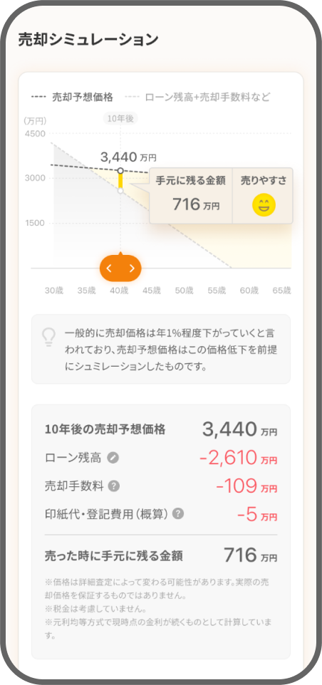査定額とローン情報を組み合わせることで、今売却したらいくら手元に残るか、または残らないのかを確認することができます。将来の売却のシミュレーションもできます。