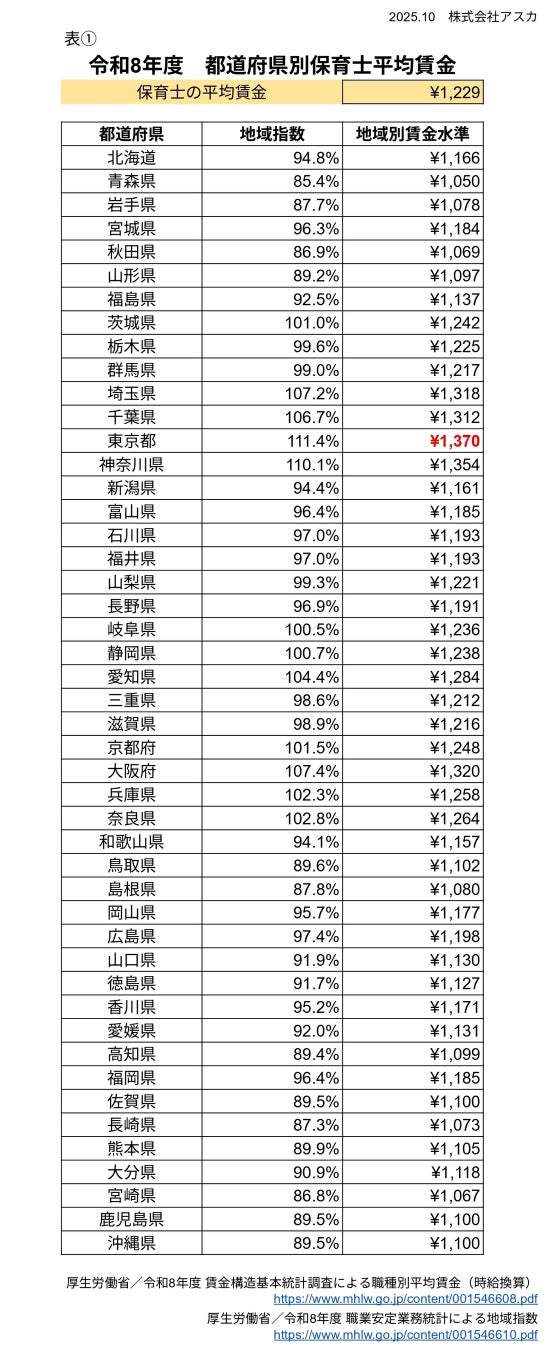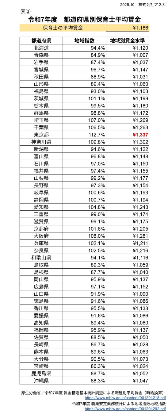 保育に特化したサービスを提供する株式会社アスカ(本社:群馬県高崎市、代表取締役会長:加藤秀明)は、令和7年10月に保育士派遣平均時給について調査しました。