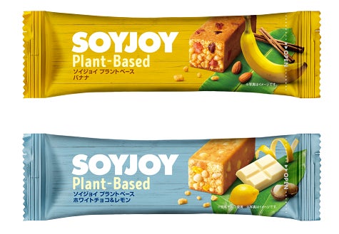 SOYJOY「プラントベース」シリーズは、栄養豊富な大豆をまるごと粉にしたグルテンフリーの生地に、フルーツやナッツなどを加えた大豆バーSOYJOYの新シリーズ。100%植物由来の原材料にこだわり、本ブランド初のヴィーガン認証※1を取得しました。素材の香りと、大豆パフのサクサクとした食感の高タンパクな低GI食品※2です。豆乳で出来た濃厚なホワイトチョコと爽やかなレモンピールの後味が特徴の「ホワイトチョコ&レモン」と、口の中で滑らかに広がる芳醇なバナナとシナモンの香りが特徴の「バナナ」の2種のラインナップ。