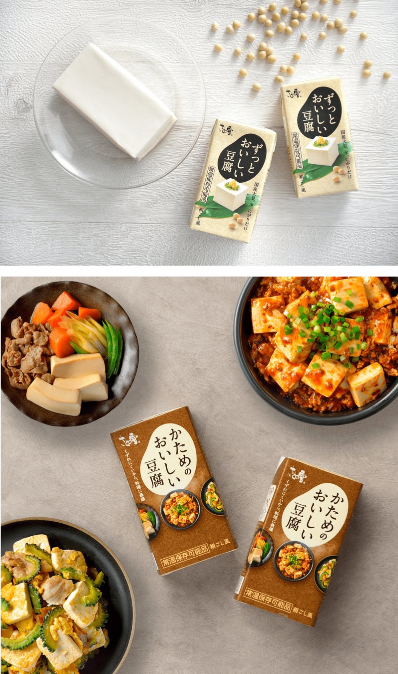 「かためのおいしい豆腐」は、ずっとおいしい豆腐同様常温で120日間保存が可能で、料理にぴったりなしっかりとしたかたさのある豆腐です。調理中に豆腐が崩れてしまいがちな「煮る」「焼く」「炒める」など様々な調理法に適しています。
