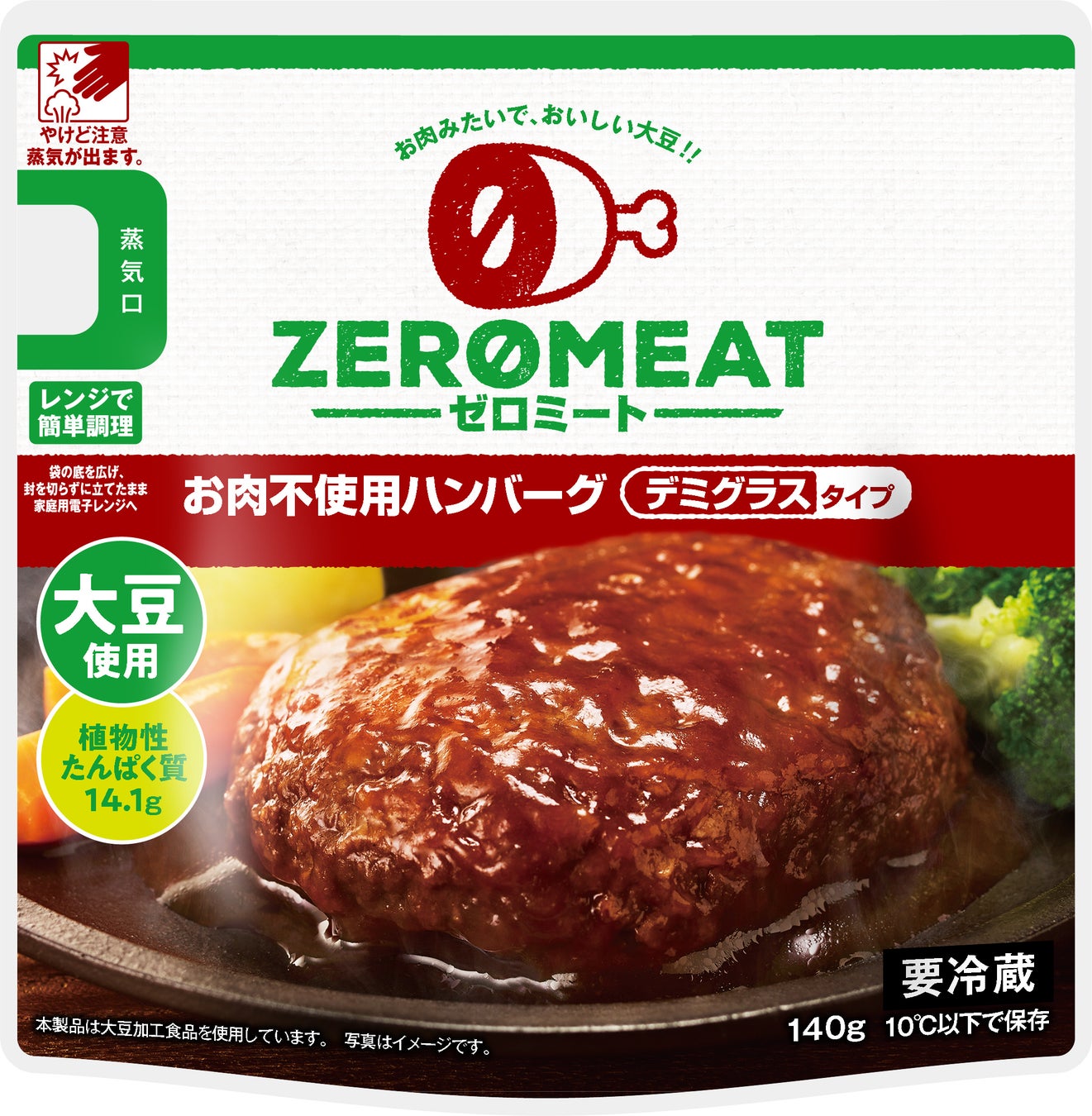 「ゼロミート」はお肉・卵を使わない、動物性原材料※1不使用のハンバーグです。お肉の代わりに大豆※2を使うことで、食べごたえはあるのにヘルシー。お肉を食べているような食感や香りにこだわりつつ、大豆由来のすっきり感を活かした味わいが楽しめます。動物性原材料不使用のデミグラスタイプのソースも大豆のパティとの相性にこだわり、夕食のメインディッシュになるような味わいとボリューム感で作っています。忙しい方にも楽しんでいただけるように、レンジで温めてそのまま食べられる手軽さも大切にしています。