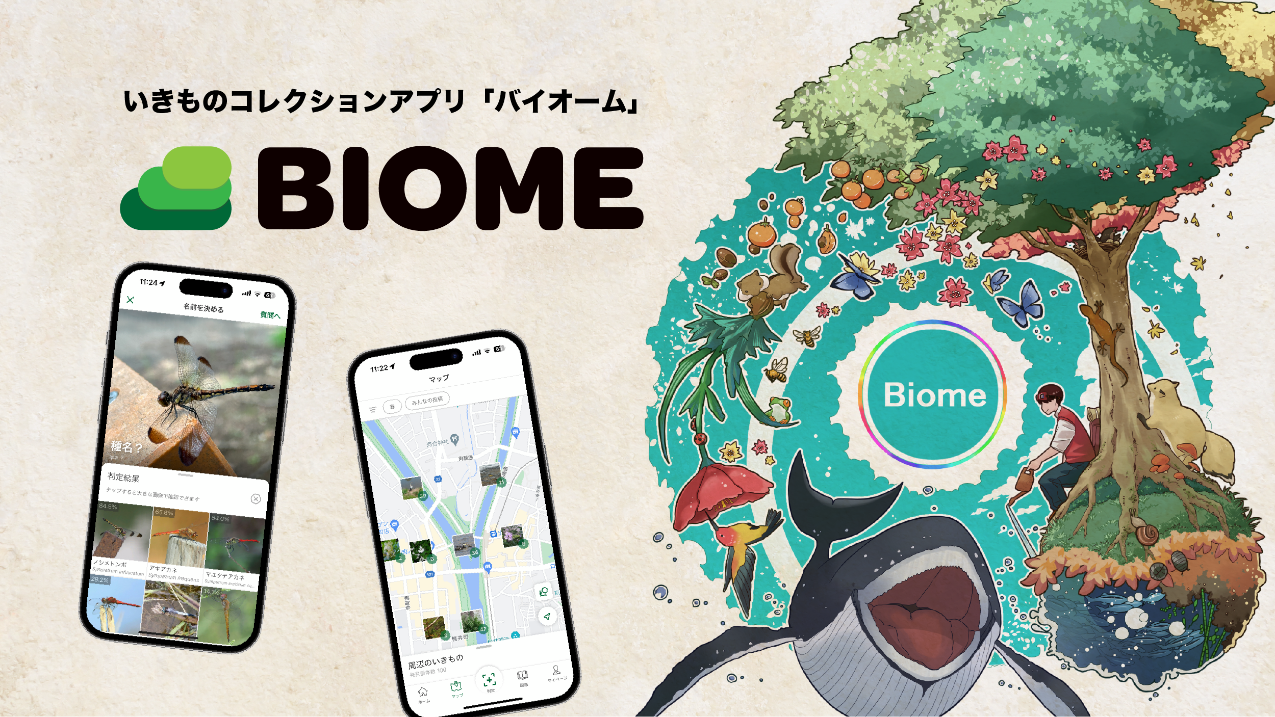 バイオームは、誰でも気軽に生物調査に参加できるいきものコレクションアプリBiome(バイオーム)を通して、ユーザーの皆さんと一緒に幅広い地域の生物データを蓄積、国内最大級の生物分布ビッグデータを構築。またこのデータをもとに、生物多様性分野に特化した複数のサービスを開発・運営しています。