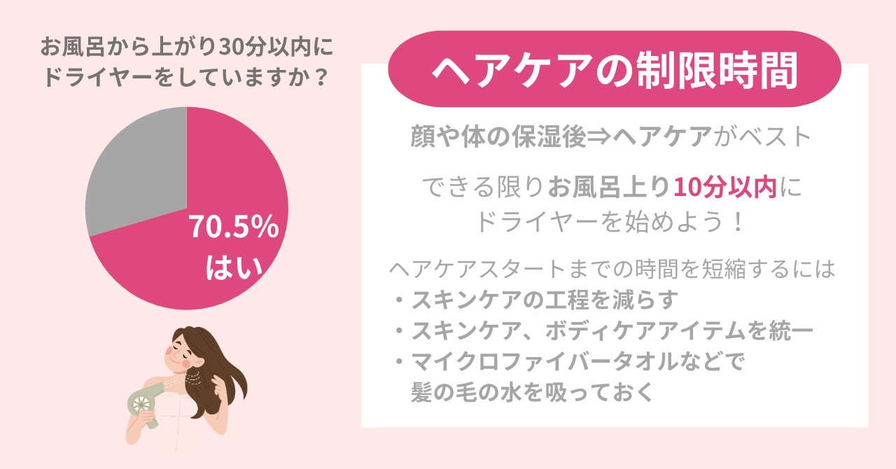 ・70.5%の女性がお風呂上り30分以内にドライヤーをしている