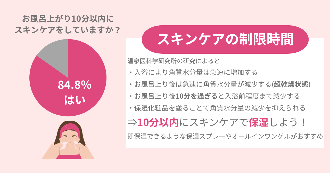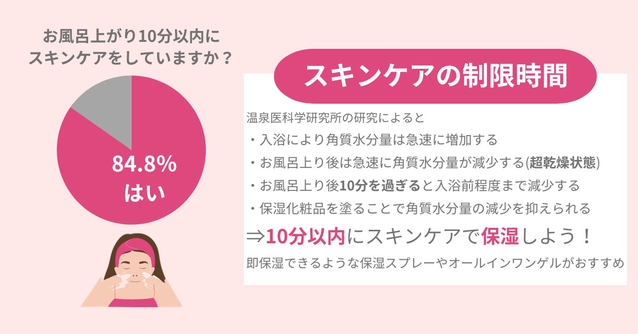 ・84.8%の女性がお風呂上り10分以内にスキンケアをしている