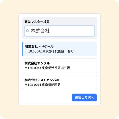 宛先マスターからの選択で、ふりがな・住所の自動補完を実現し、入力ミスや書き間違えを根絶します。
