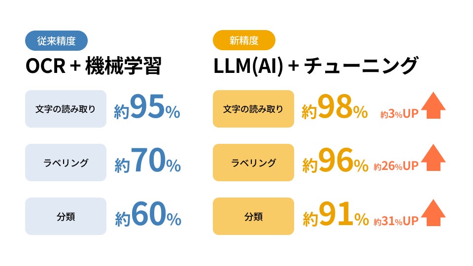 従来の「OCR+機械学習」による台帳作成と宛先推定の仕組みを刷新し、「LLM(AI)+チューニング」を導入することで、処理精度が飛躍的に向上しました。