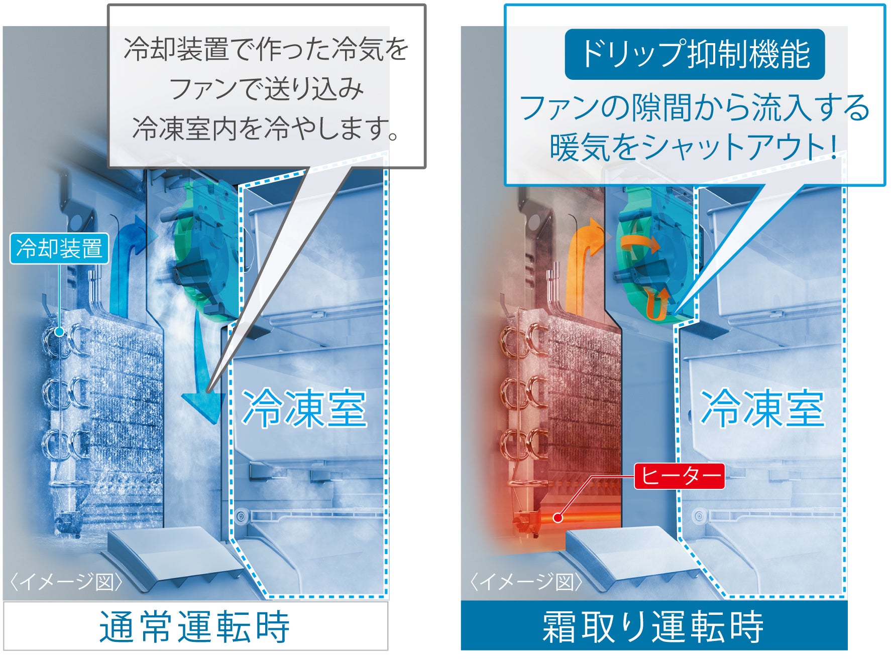 ドリップ抑制機能を搭載した「おいシールド冷凍」はAQUA独自の冷凍技術です。冷蔵庫の自動霜取り運転時に発生する暖気の侵入を防ぎ、冷凍室内の温度変化を抑えます。これにより食材を霜つきから守り、冷凍した食材のうまみや食感を損なわず長期間おいしさを保ちます ※5。