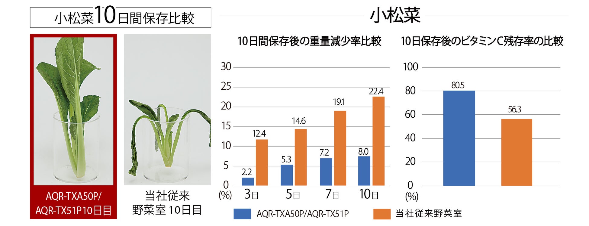 ※4:試験条件/ AQR-TX51PとAQR-SV38K(2021年モデル)を各1台用意し、AQR-TX51Pの野菜室(うるおいエリア)を試験区、AQR-SV38Kの野菜室を対照区として約1.8kgの野菜をラップなし、ドア開閉なし、ツインLEDオフで保存しました。保存期間を10日間とし、保存前および保存後にそれぞれの項目を評価しました。小松菜の保存後の重量減少率はAQR-SV38K 22.4%、AQR-TX51P 8.0%。保存後のビタミンC残存率AQR-SV38K 56.3%、AQR-TX51P 80.5%。運転状況や食品の種類、状態や量により、効果は異なります。当社調べ。