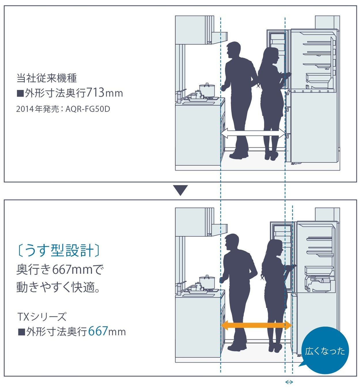 冷蔵室最上段の奥まで手が届きやすく、キッチンカウンターと面を揃えやすい薄型設計です。取り残しがちな、奥にしまった食材も取り出しやすくなり使い勝手が向上するだけでなく、キッチンのスペースが広く使えます。