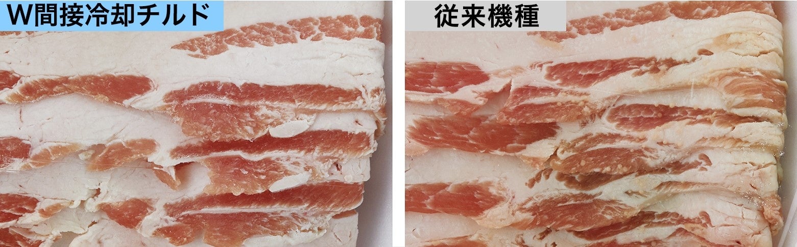 ※3:試験条件/W間接冷却チルド搭載機種(AQR-TX51P)と非搭載の従来機種(AQR-SV38K)を各1台用意し、W間接冷却チルドルーム(微凍モード)を試験区、AQR-SV38Kのチルド室を対照区としました。保存期間を16日間とし、保存前および保存後にそれぞれの項目を評価しました。豚バラ肉を購入し、パックのまま保存。一般生菌数: 初期菌数 1.3✕103(CFU/g), 保存後 AQR-SV38K 7.8✕108(CFU/g) 、AQR-TX51P 1.0✕103(CFU/g)。 (一財)日本食品分析センター分析(成績書番号:第23021241007-0101号、第23021241008-0101号、第23021241009-0101号)。