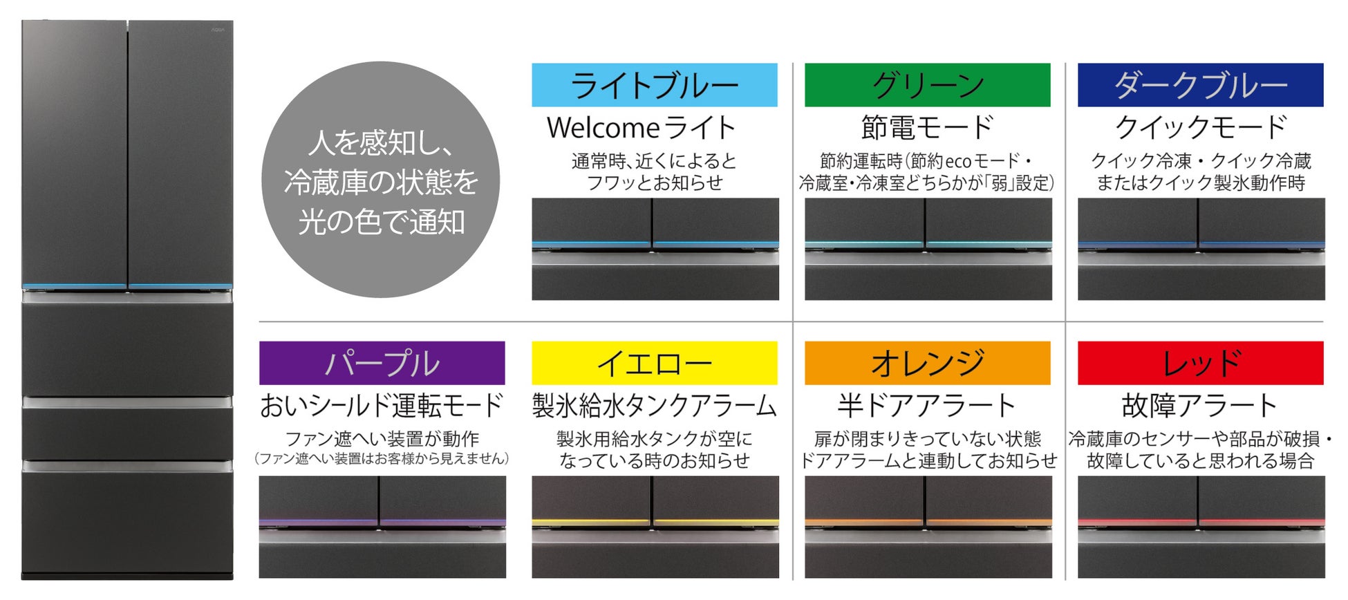 また、冷蔵室扉に設置したLEDステータスバーは冷蔵庫に近づくと人感センサーが感知して運転状況を7色の光でお知らせ※6。柔らかい発色で空間にさりげなく彩りを添えます。