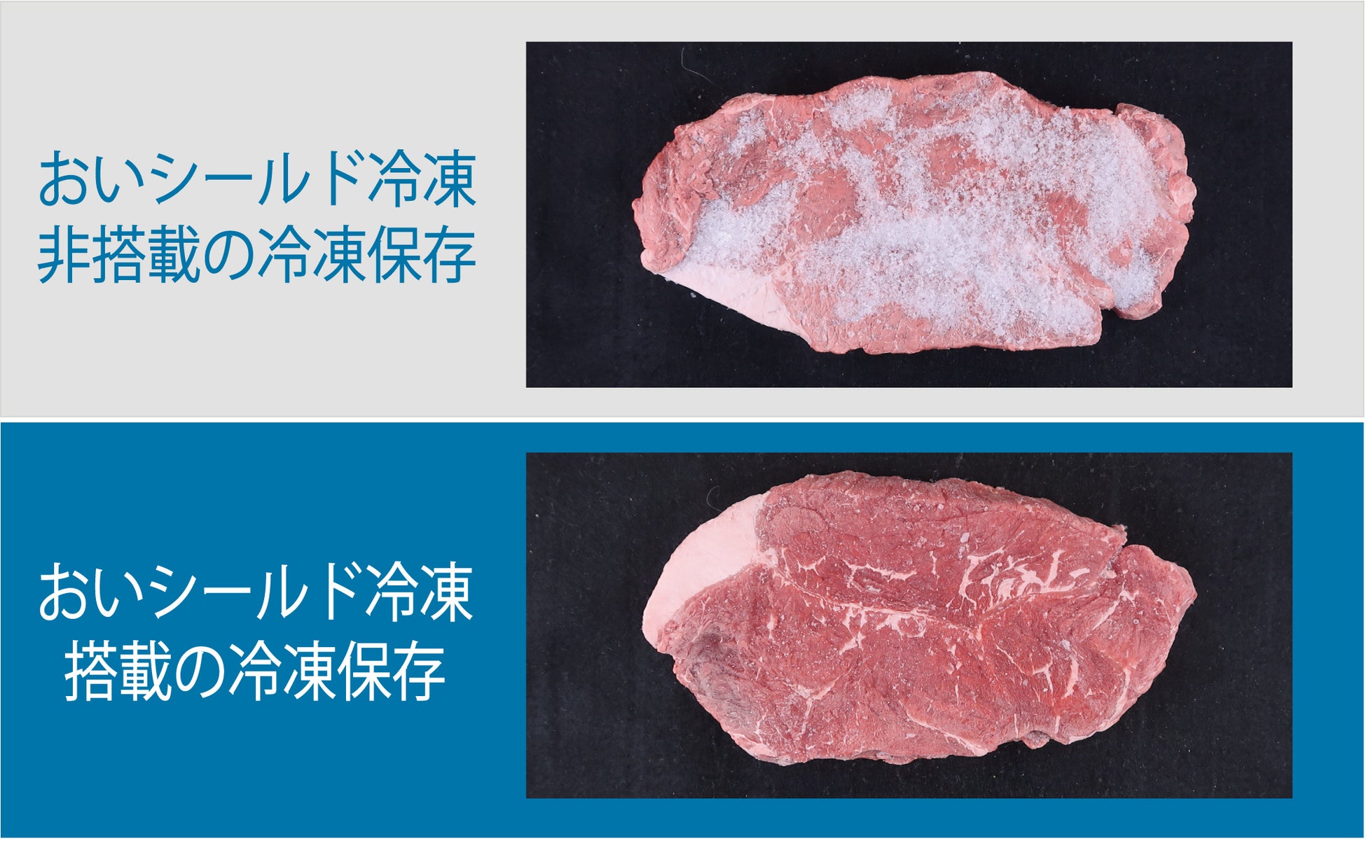 ※5:試験条件:おいシールド冷凍が搭載されたAQR-TX51Pと非搭載のAQR-SV38K(2021年モデル)を各1台用意し、それぞれの冷凍室に食品ポリ袋に入れた牛肉を保存しました。保存期間を31日とし、保存前及び保存後の外観を観察しました。当社調べ。