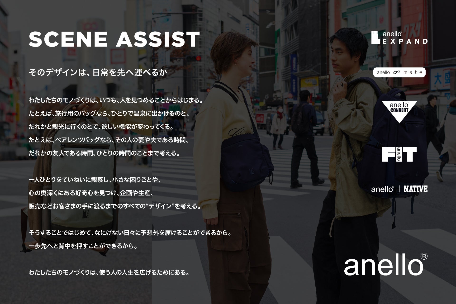 anello®は、2005年に株式会社キャロットカンパニーが立ち上げたバッグブランドです。イタリア語で「年輪」を意味するブランド名には、「少しずつ、着実に成長し続けたい」という創業者の想いが込められています。「こだわりすぎず、でもちょっとしたポイントと機能性がある、長く愛されるバッグを丁寧に生み出すこと」を理念に、現在は35カ国・360店舗以上での展開を誇るグローバルブランドとして世界中のお客様に支持されています。誕生20周年を迎えた2025年、新コンセプト「SCENE ASSIST」を掲げ、新たなステージへと踏み出します。
