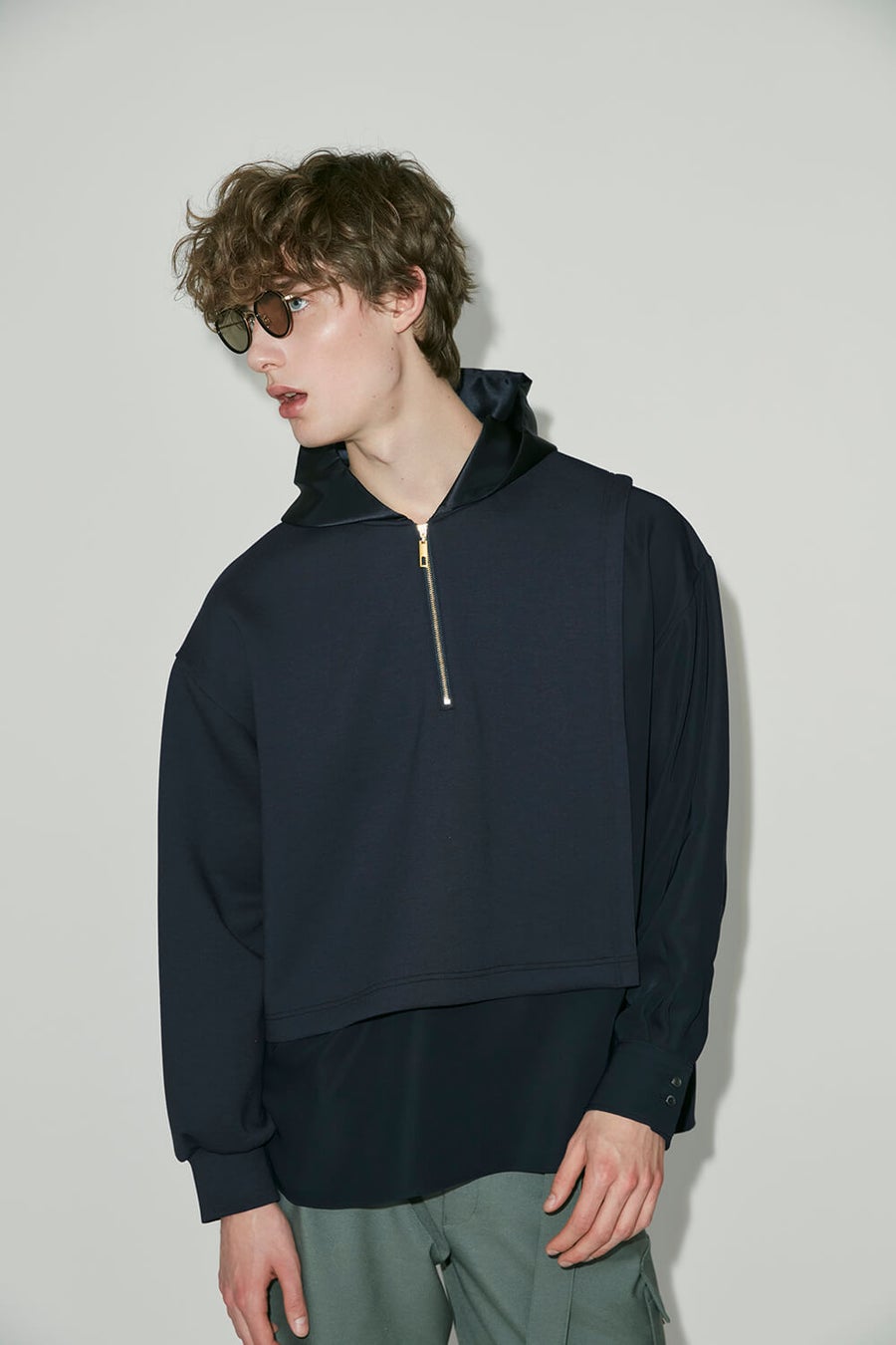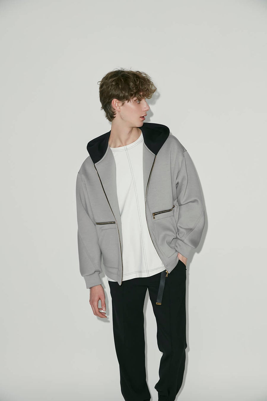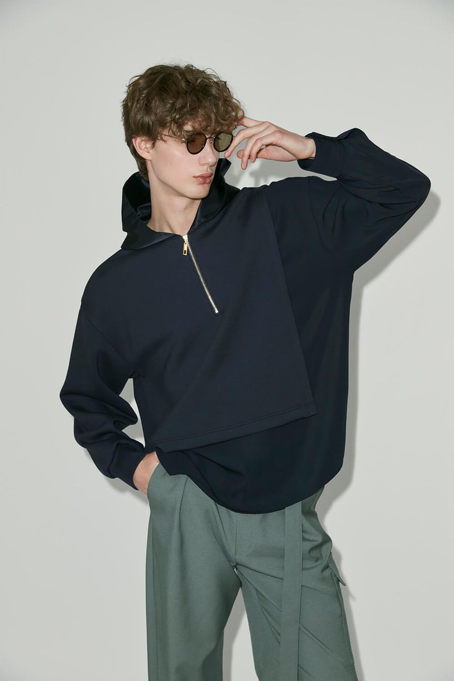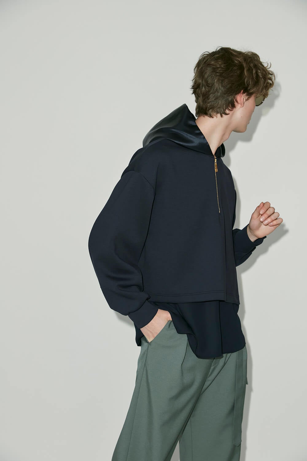 「膨らみ感と上品な光沢感のあるダンボール素材」+「とろみのあるシャツ生地」+「光沢感のあるナイロンツイルのフード」を掛け合わせたアシンメトリーデザインが特徴。