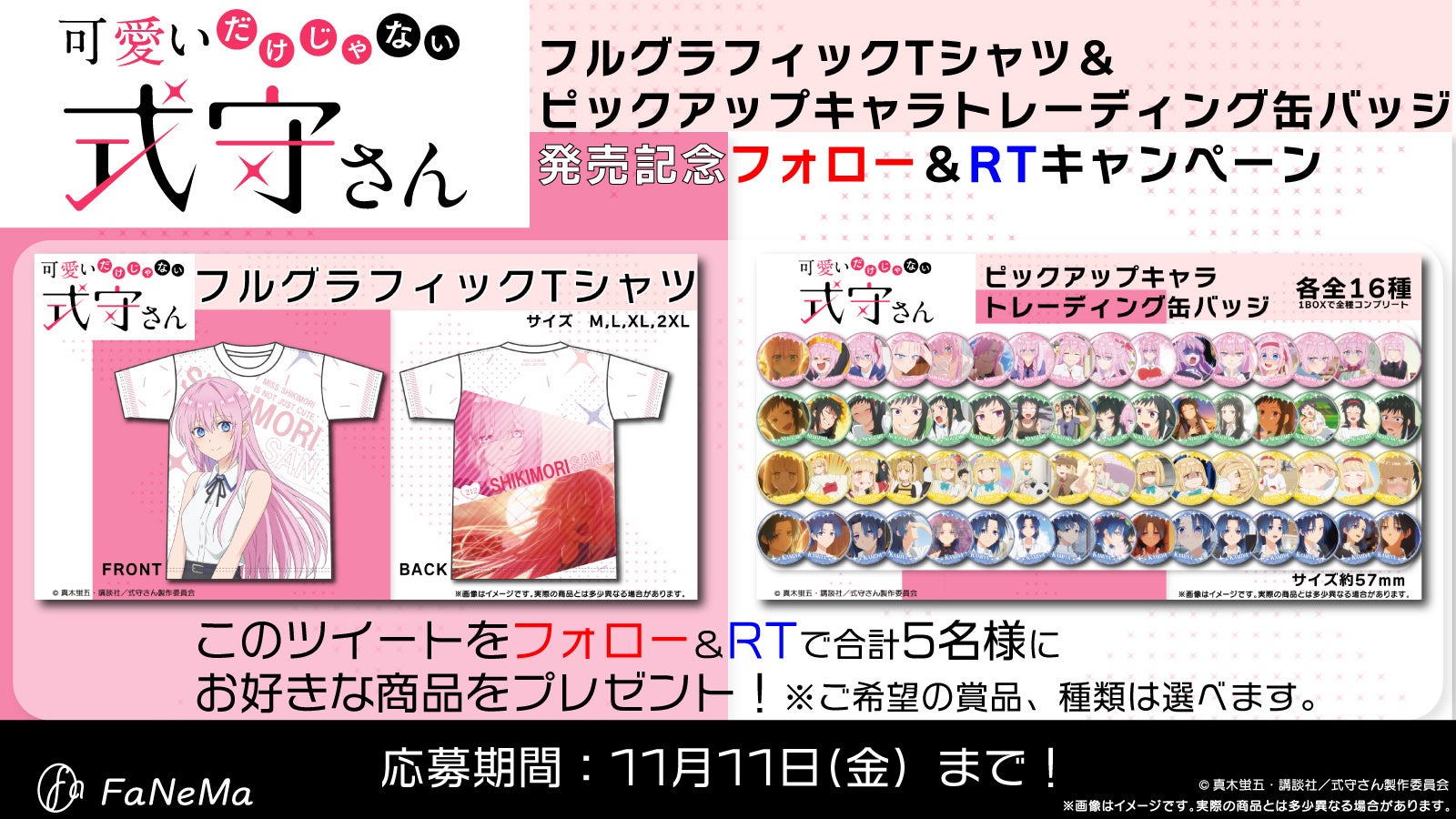 TVアニメ『可愛いだけじゃない式守さん』より「フルグラフィックTシャツ&ピックアップキャラトレーディング缶バッジ」の発売を記念して、Twitterフォロー&リツイートキャンペーンを実施いたします。