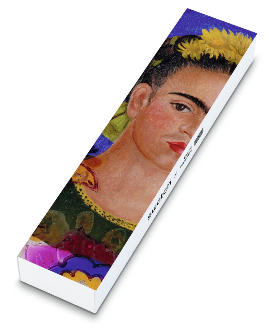 THE FRAME, BY FRIDA KAHLO, THE WATCHは、フリーダ・カーロの最も有名な自画像の一つを鏡像として文字盤の6時と12時のあいだでパーフェクトに分割。'El Marco'の明るい陽気な色彩がNEW Gentウォッチのフロント部分を飾り、ストラップのベースや下側のピンクによってパーフェクトに引き立っています。