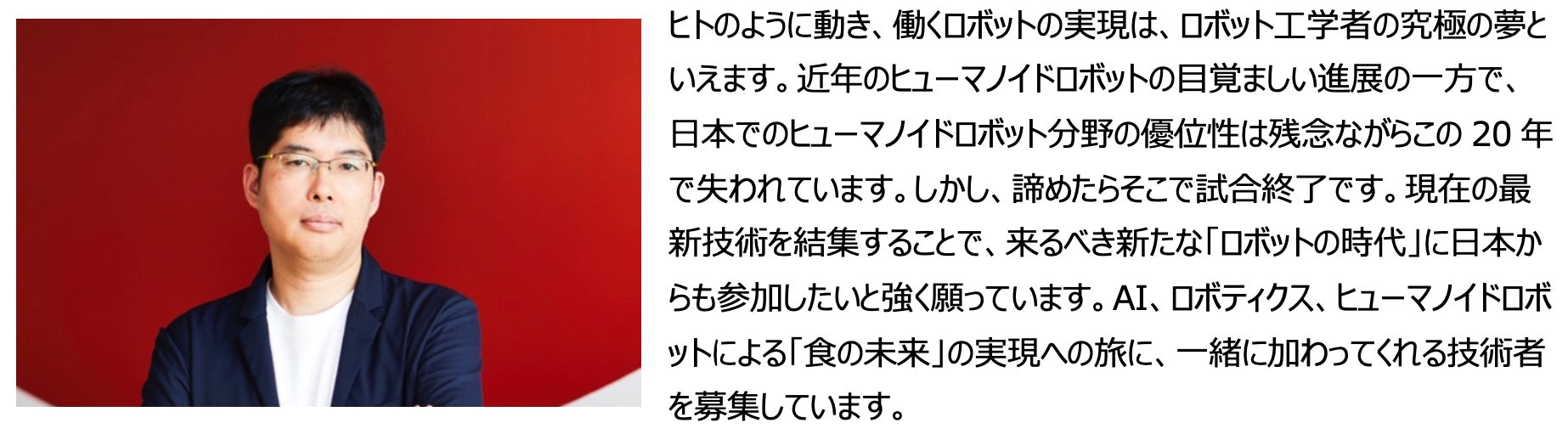 本プロジェクトでは、これまで蓄積してきた制御技術・視覚認識・動作学習といった知能ロボティクス技術をさらに進化させ、ヒューマノイドロボットの社会実装を通じて、まずは食産業での価値創造、ひいては、人口減少の続く日本の持続可能な労働インフラへとつなげてまいります。