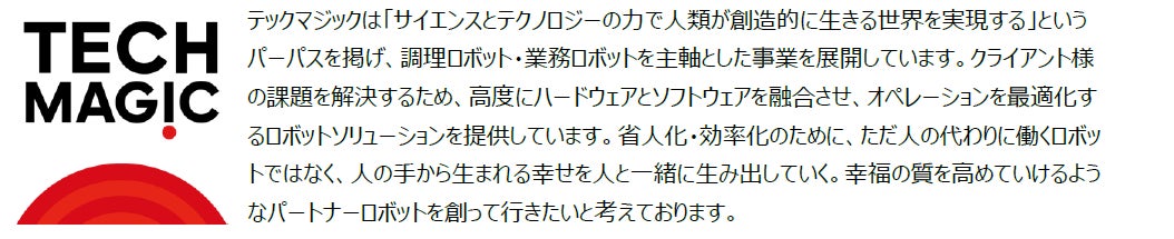 サイエンスとテクノロジーの力で、人類がより創造的に生きる世界の実現を目指すTechMagic株式会社(本社:東京都江東区、代表取締役社長:白木裕士、以下 「テックマジック」)は、これまで蓄積してきた調理ロボット/業務ロボットの技術と、ヒューマノイドロボットを融合させたシナジーにより、新たな「食の未来」を切り拓く取り組みを開始しました。