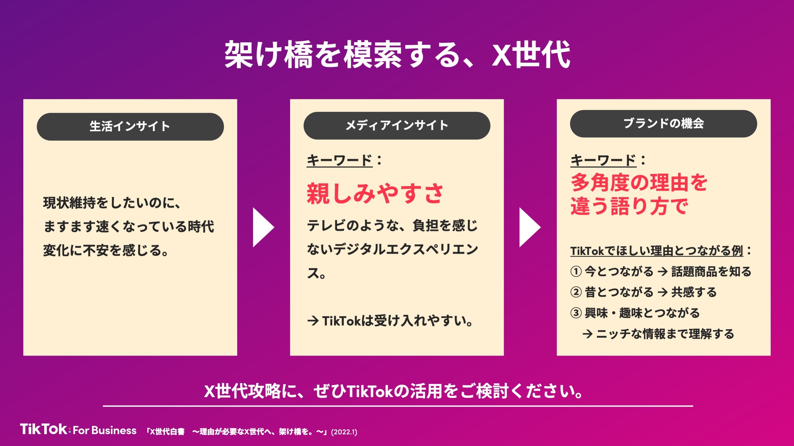 時代の変化に不安を感じている中、様々な世界や情報との「架け橋」を模索しているX世代がデジタルメディアに求めているものは、テレビのように誰もが負担を感じない「親しみやすさ」。X世代に向けたマーケティング活動で効果的なのは、「テレビに近い親しみやすさ」を持つTikTokを「架け橋」にしながら、多角度の理由を異なる語り方でブランドの姿を見せることだと言えます。