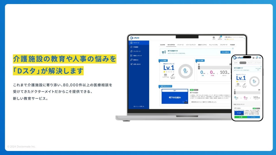 介護職向けe-ラーニングサービスのDM-study(Dスタ)は、2022年12月リリース。未経験者から施設長レベルまで幅広くカバーし、介護現場に必要な「医療知識」が身に付く学びを豊富に取り揃えております。キャリアパスに沿った教育体制の仕組みや、法定研修の準備などに悩みを抱える介護施設さまを解決・サポートします。