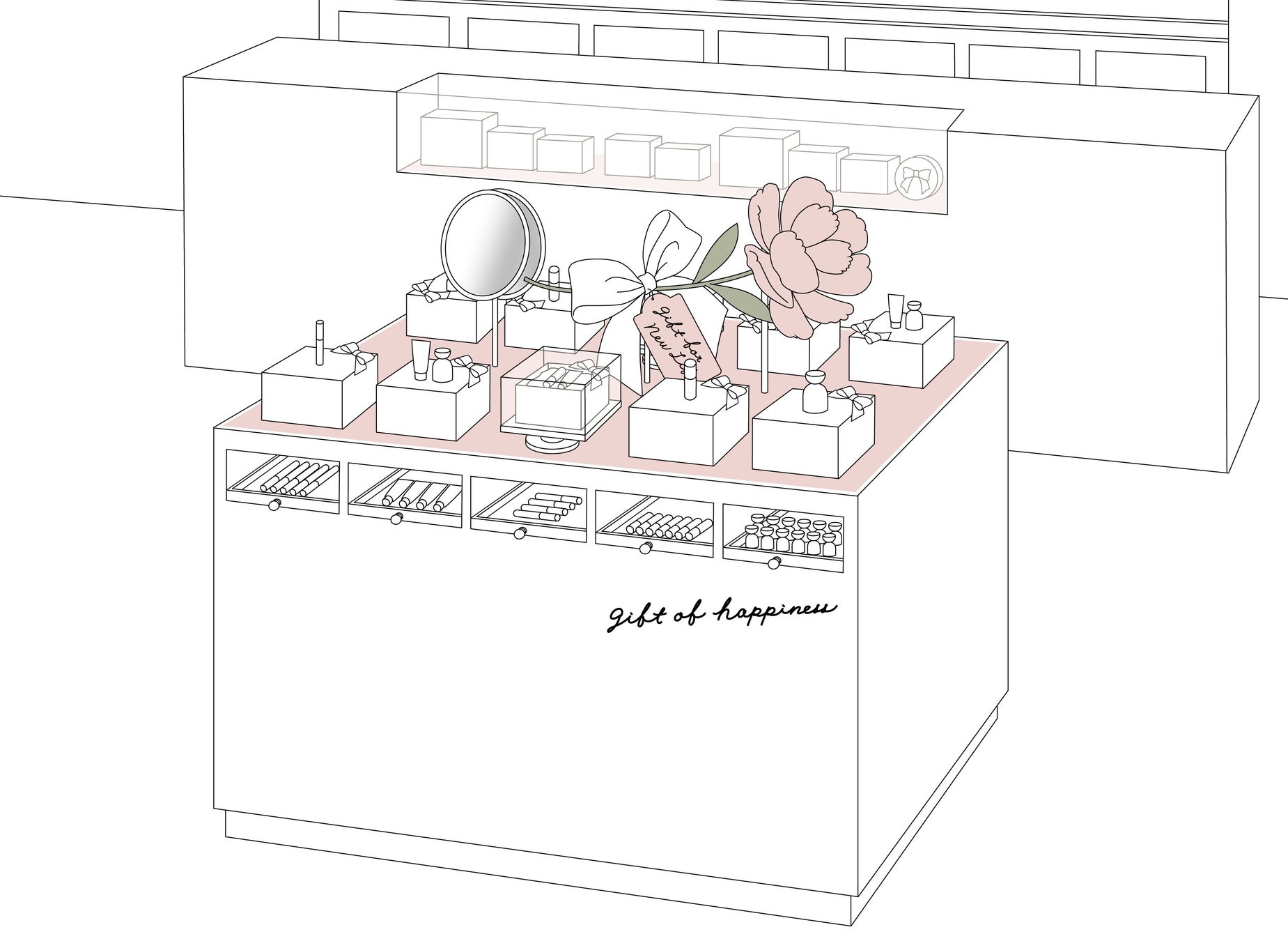 店舗中央には"Seasonal Gift”をテーマとしたギフトバーを設置。2つのブランドのシーズンにあわせた最適なギフトをご提案し、ギフトを選ぶ楽しさを演出します。オープンを記念して、ご購入特典の他、オープニング限定キットをご用意しております。