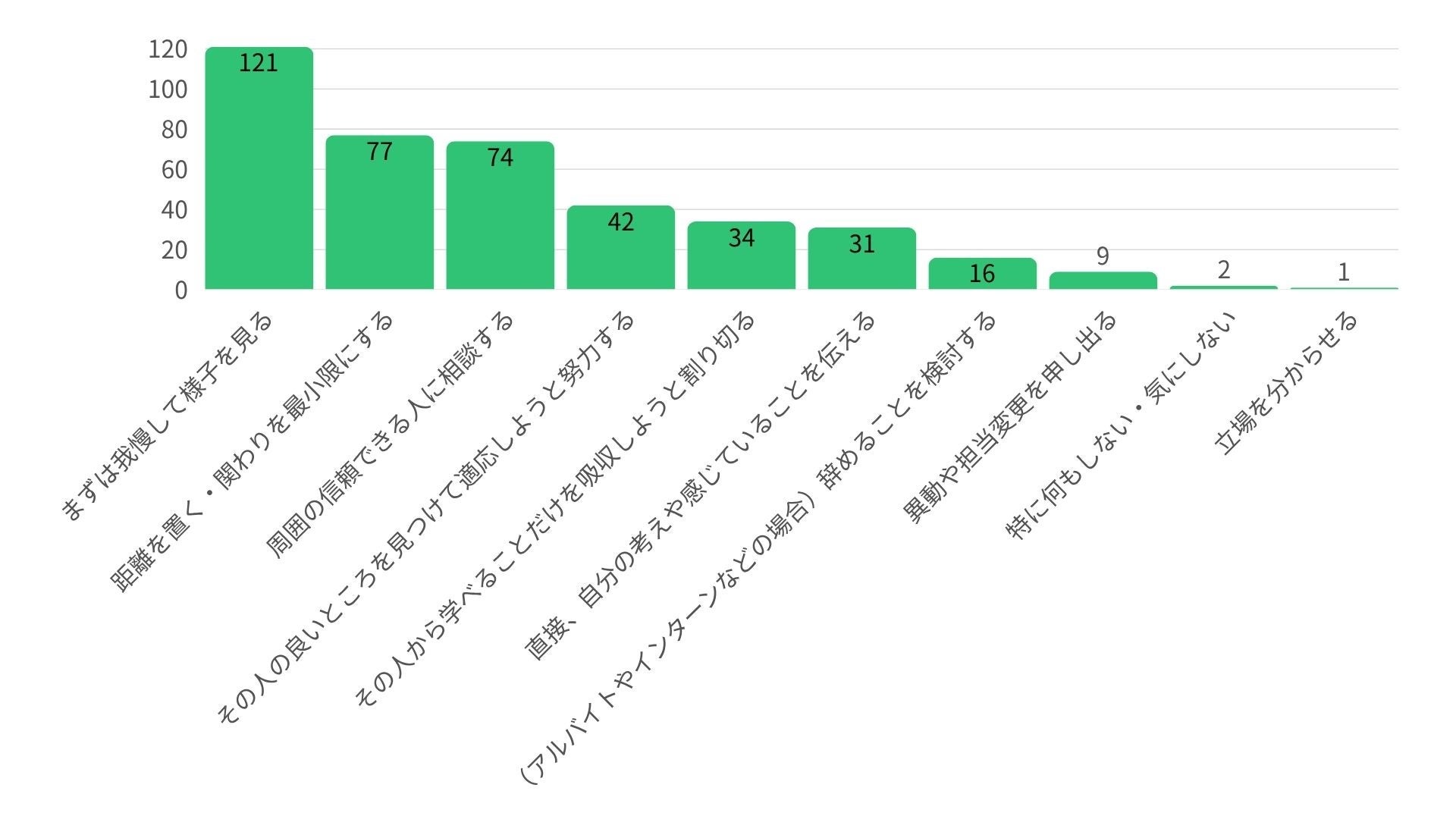 「周囲に相談する」(22.2%)、「距離を置く」(17.0%)が続き、直接的なアクションを避ける防御的な行動が上位を占める。