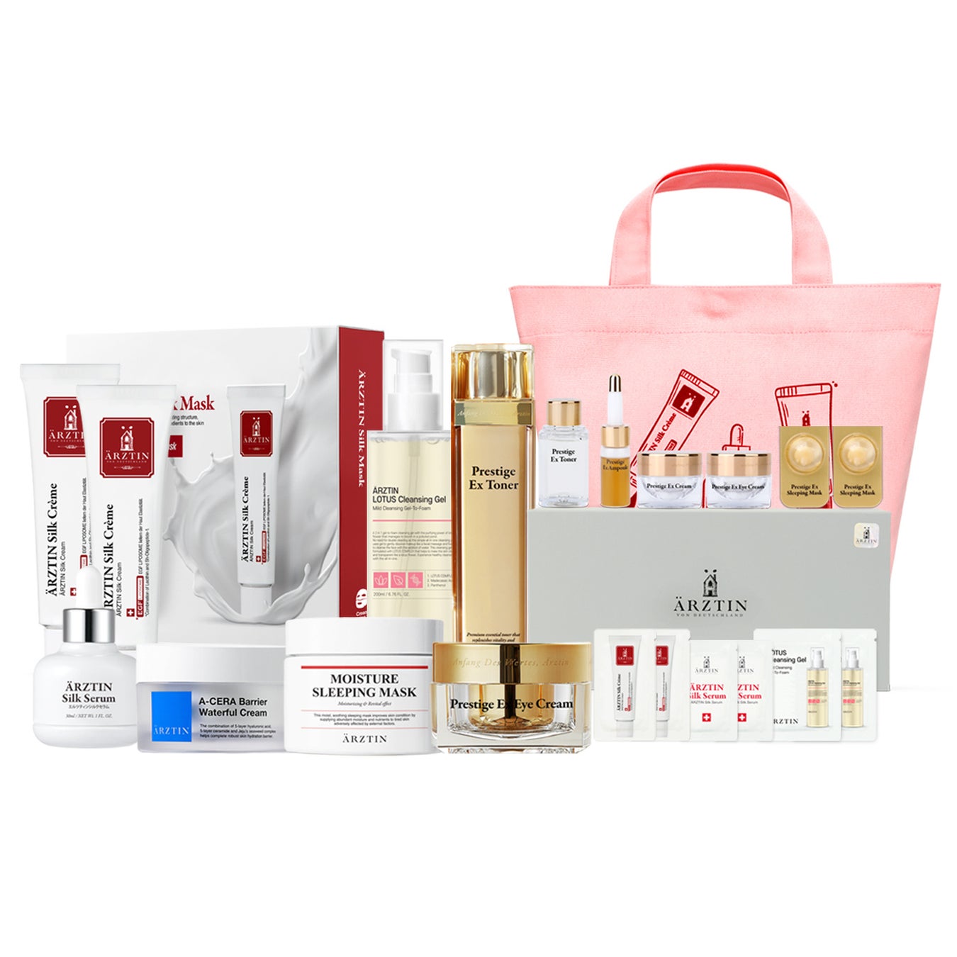今年の福袋は25,000円(税込)と13,500円(税込)の2種類を準備しており、25,000円の福袋には、 洗顔料、化粧水、美容液、クリーム、マスクと基礎スキンケアが揃えられる充実した中身の現品合計9点、さらにプレゼント4点と定価60,000円相当の内容で約58%OFFになります。 プレゼントは、エルツティンオリジナルエコバッグと、 特に今年はプレステージExキットもプレゼントとして含まれているので、 例年よりも豪華な内容となっています。