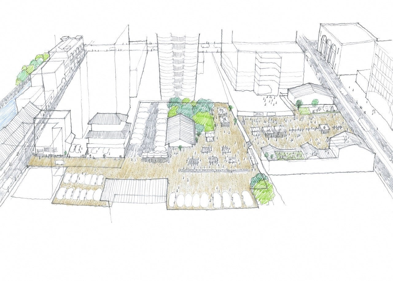 150mの延長を活かし、テーブルや椅子を多数配置することで、ロジを浮かび上がらせ、来街者にロジの存在や空間を体感してもらいます。当地の歴史や魅力を紹介するサインや動画放映によりロジへの流入を誘発します。空間の広さや周辺の施設配置や日陰の位置等の特性を踏まえ、人工芝、植栽、日陰テント等の配置により佇みたくなる空間を提供します。