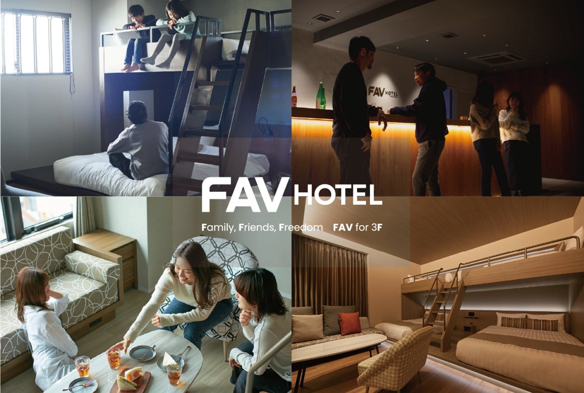 『FAV HOTEL』は、“Family, Friends, Freedom”の3つのFをテーマとし、洗練された空間をリーズナブルに楽しめるグループステイ向けのホテルブランドです。4人以上がゆったり滞在できるアパートメントホテルとして、主要観光都市を中心に全国各地で展開しています。広々とした客室に上質な家具や家電製品を備え、中長期滞在やワーケーションにも適した「暮すように泊まる」宿泊体験を提供することで、地域創生への貢献を目指します。