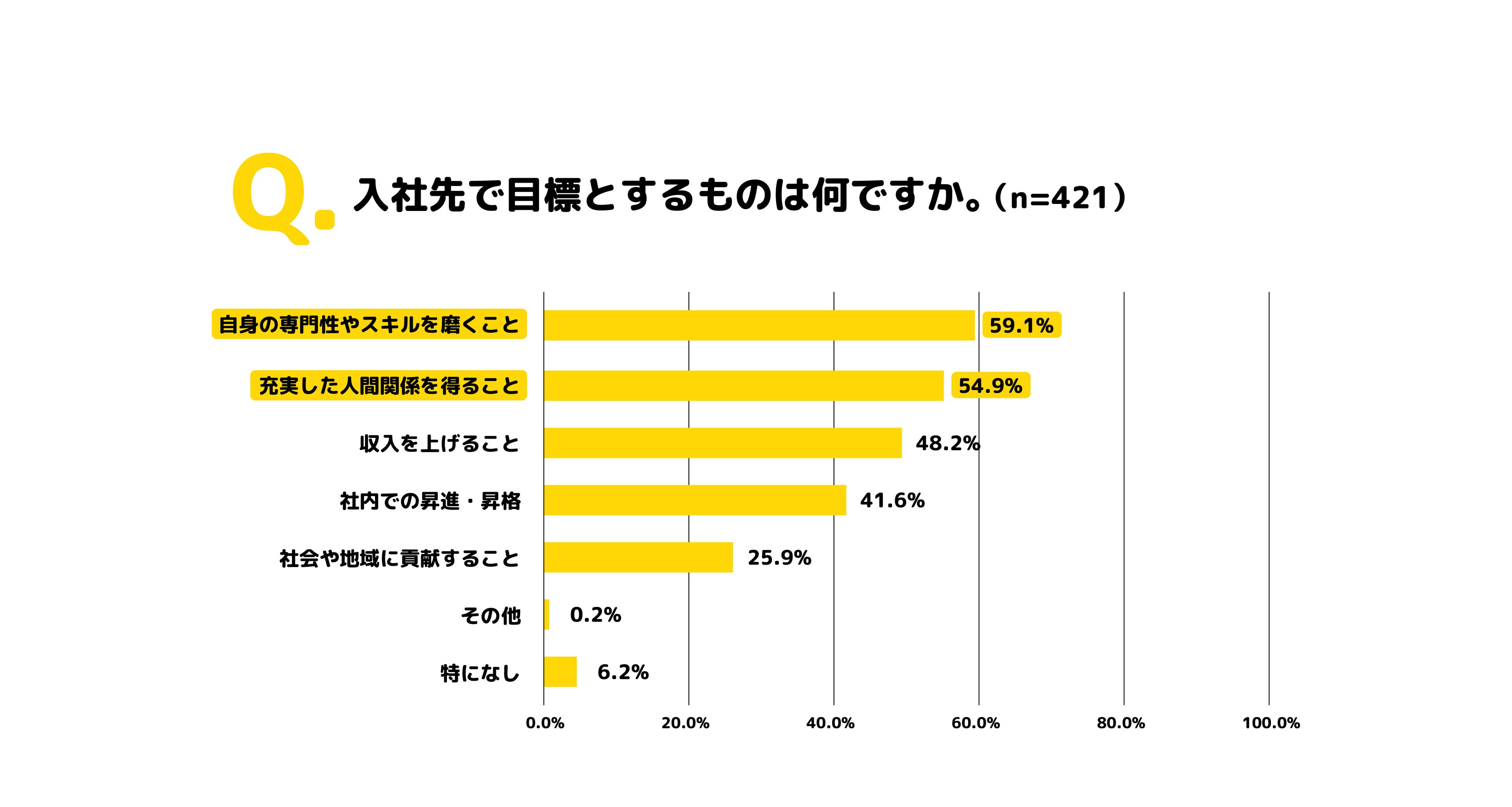 新卒が就職先に求めることとしては「社内での昇進・昇格」(41.6%)や「収入を上げること」(48.2%)よりも、「自身の専門性やスキルを磨くこと」(59.1%)と「充実した人間関係を得ること」(54.9%)が上位にランクイン。職場での経験が、どれだけ自分自身の身になるかを重視していることが判明しました。