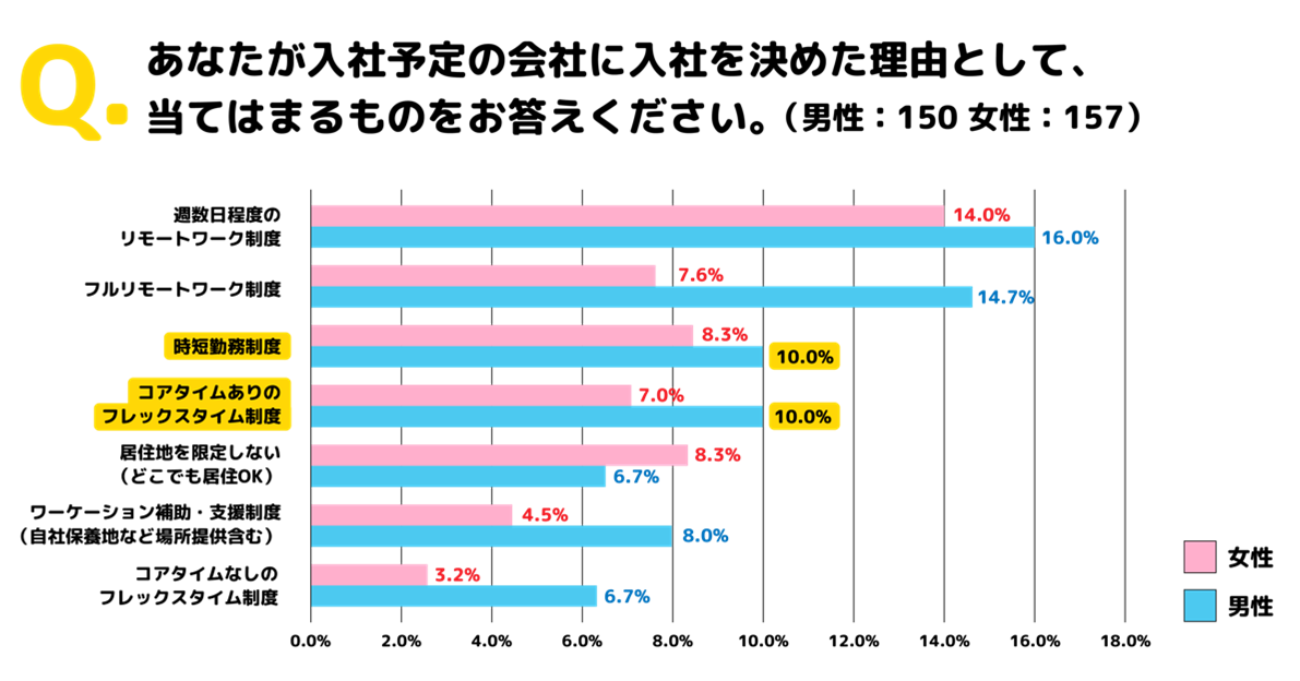 2022年4月入社予定の会社に「入社を決めた理由」を聞いたところ、「時短勤務制度」や「フレックスタイム制度」など時間に関わる制度については、男性が女性を上回る結果に。かつて「女性の社会進出」を目的として導入が推進された制度について、男性が取得に前向きであることからも、男女共に「働く時間に融通が利く」環境下で、仕事とプライベートの両立を目指すことが一般的になってきている可能性があることがわかりました。