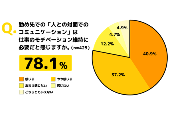 新卒にとって世代の近い先輩となる2022年4月で社会人2年目~5年目を迎える若手社員のうち、78.1%が「仕事のモチベーションを維持するために、人との対面のコミュニケーションが必要」と回答(n=425)しています。