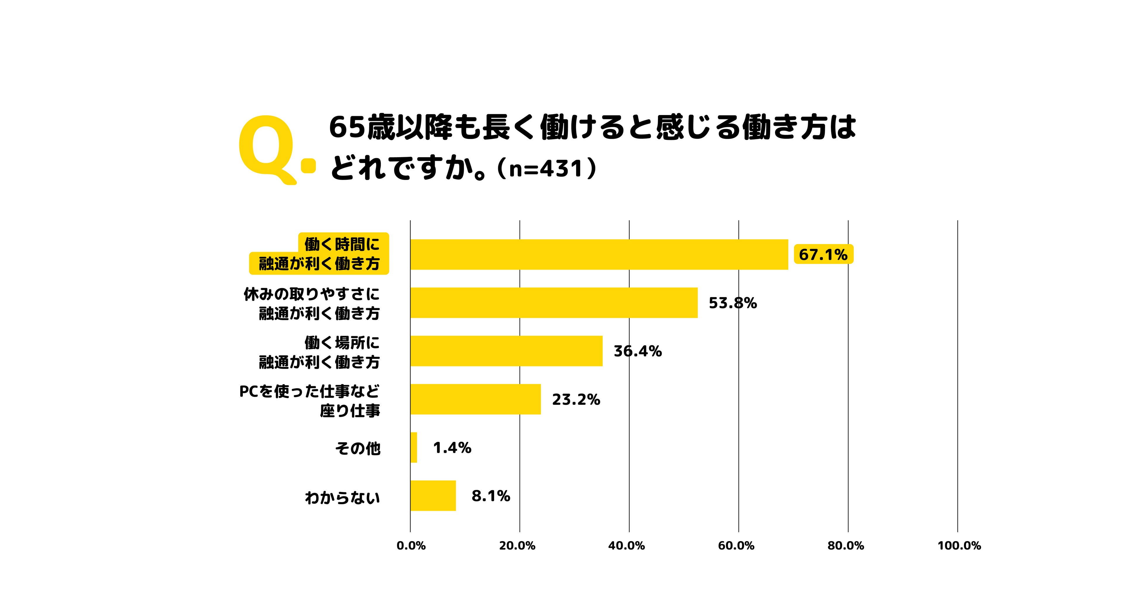 本調査は、オンラインとオフラインのどちらかに偏るのではなく、働く人が目的にあわせて働き方を選べる「多様な働き方」を推進することが、働き手の抱える「長く働くことへの不安」の解消につながり、労働人口が減少する現代におけるひとつの解決策となる、という示唆を得られる結果となりました。