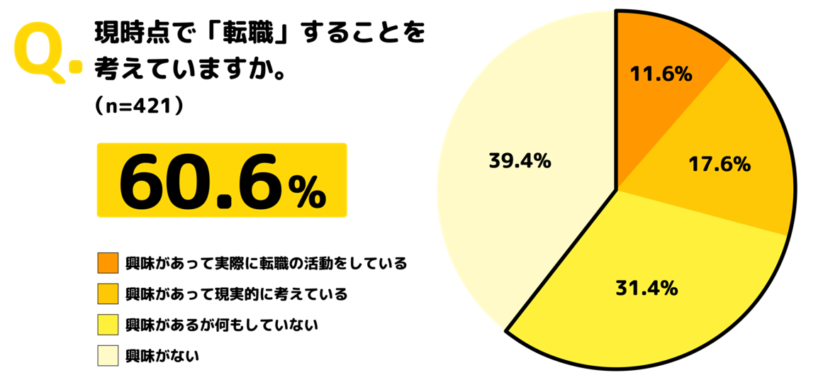 さらに、全体の60.6%が入社前から「転職に興味がある」と回答しており、理由として「ライフプランに対して収入に不安がある」ことや「環境を変えることで専門性やスキルをより磨きたい」ことを挙げていることから、将来に向けて着実にスキルを獲得し、自身の理想とするライフプランを実現することへの意欲的な姿勢がうかがえます。