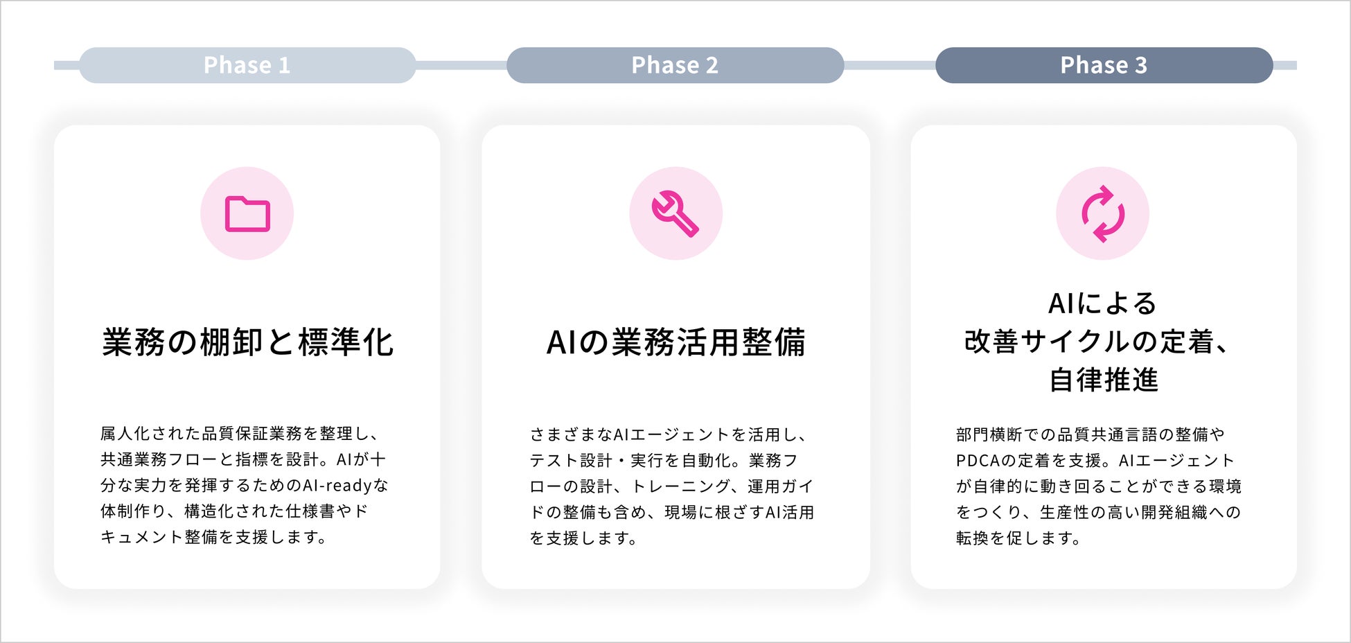 さまざまなAIエージェントを活用し、テスト設計・実行を自動化。業務フローの設計、トレーニング、運用ガイドの整備も含め、現場に根ざすAI活用を支援します。