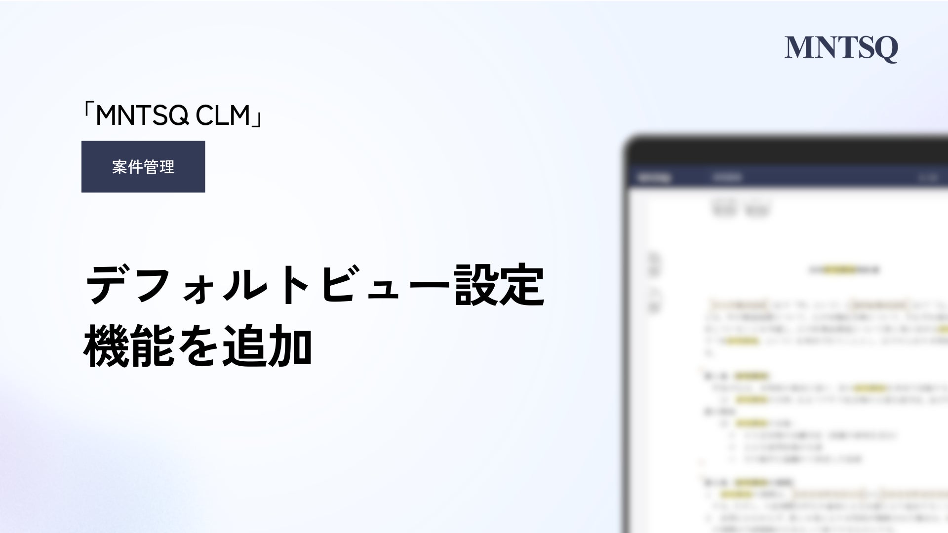 「すべての合意をフェアにする」をビジョンに掲げるMNTSQ株式会社(本社:東京都中央区、代表取締役:板谷 隆平、以下「当社」)は、「MNTSQ CLM」の案件管理画面にデフォルトビュー設定機能を追加したことをお知らせいたします。