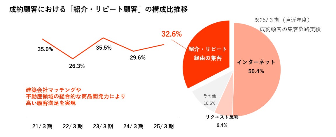 当社では、ご成約頂くお客様のうち、30%以上が紹介・リピートによるお客様で成り立っており、創業以来の蓄積で勝ち得たこの知名度と多くのお客様との関係値は、当社のコアコンピタンスと言えます。