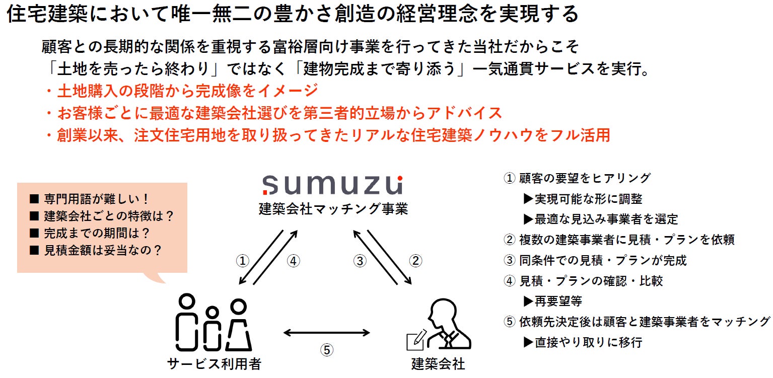 独自のサービスとして「建築会社マッチング」を行っており、お客様に最適な建築会社をご提案し、担当者の選定から、建築プランの作成、建物完成までをサポートするコンサルティングを行っております。