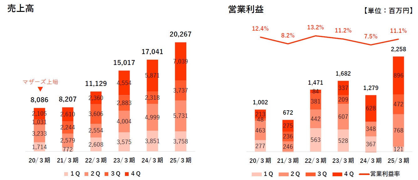 上場以降の5期間において、CAGR(年平均成長率)で売上高20.1%、営業利益17.6%の成長を記録しています。5年間では売上は2.5倍、利益は2.3倍になりました。
