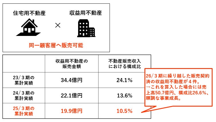 コア事業である住宅用不動産事業の利益水準が改善したことで、業績目標を達成し、今期(25/3期)に売上ヒットを予定していた収益用不動産を来期(26/3期)に繰り越すことが可能となりました。