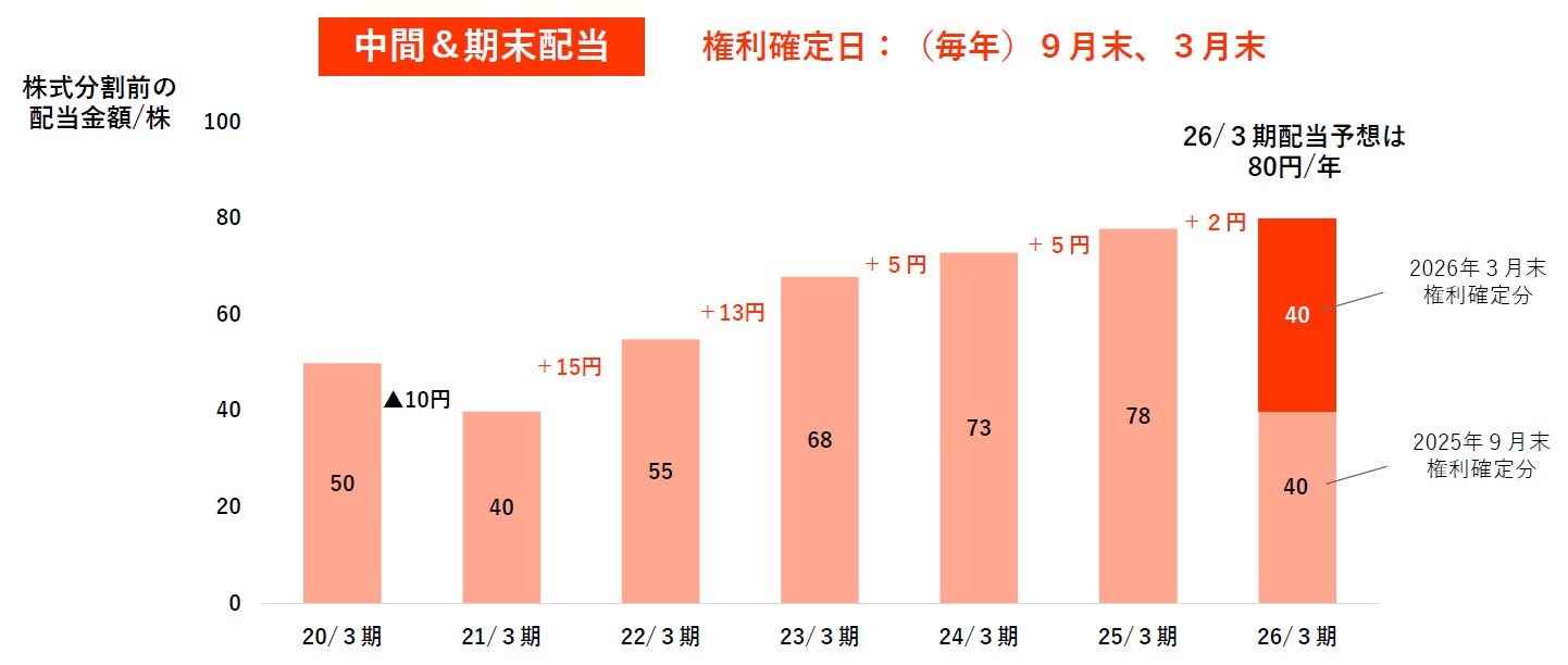 ※同時に株式分割を行っておりますので、分割後は20円×2回で年間配当額40円(分割前基準では40円×2回)となります。株式分割による配当リターンにおける株主様のデメリットはございません。